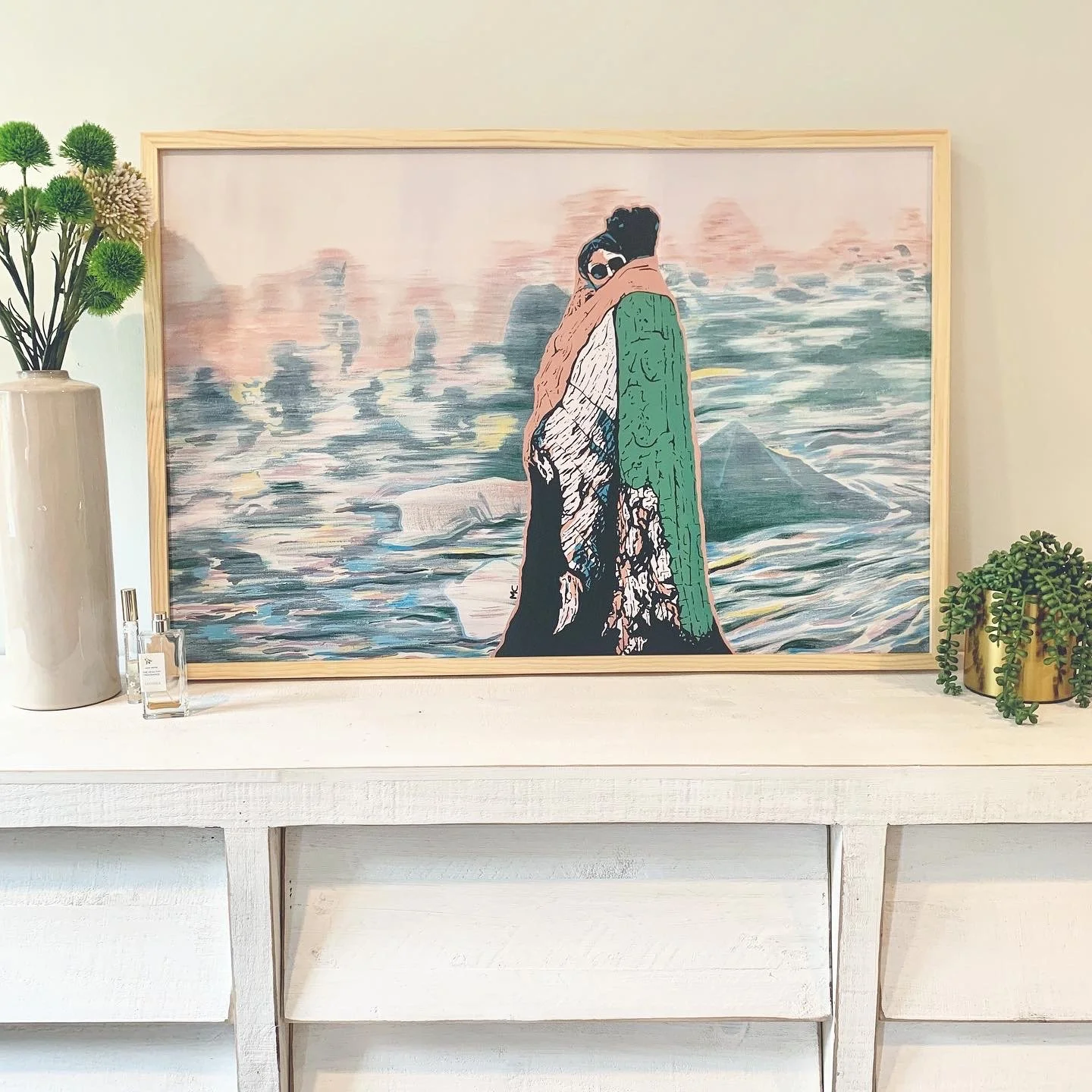 Details: acrylic paint on 24”x36” canvas, natural wood floating frame.