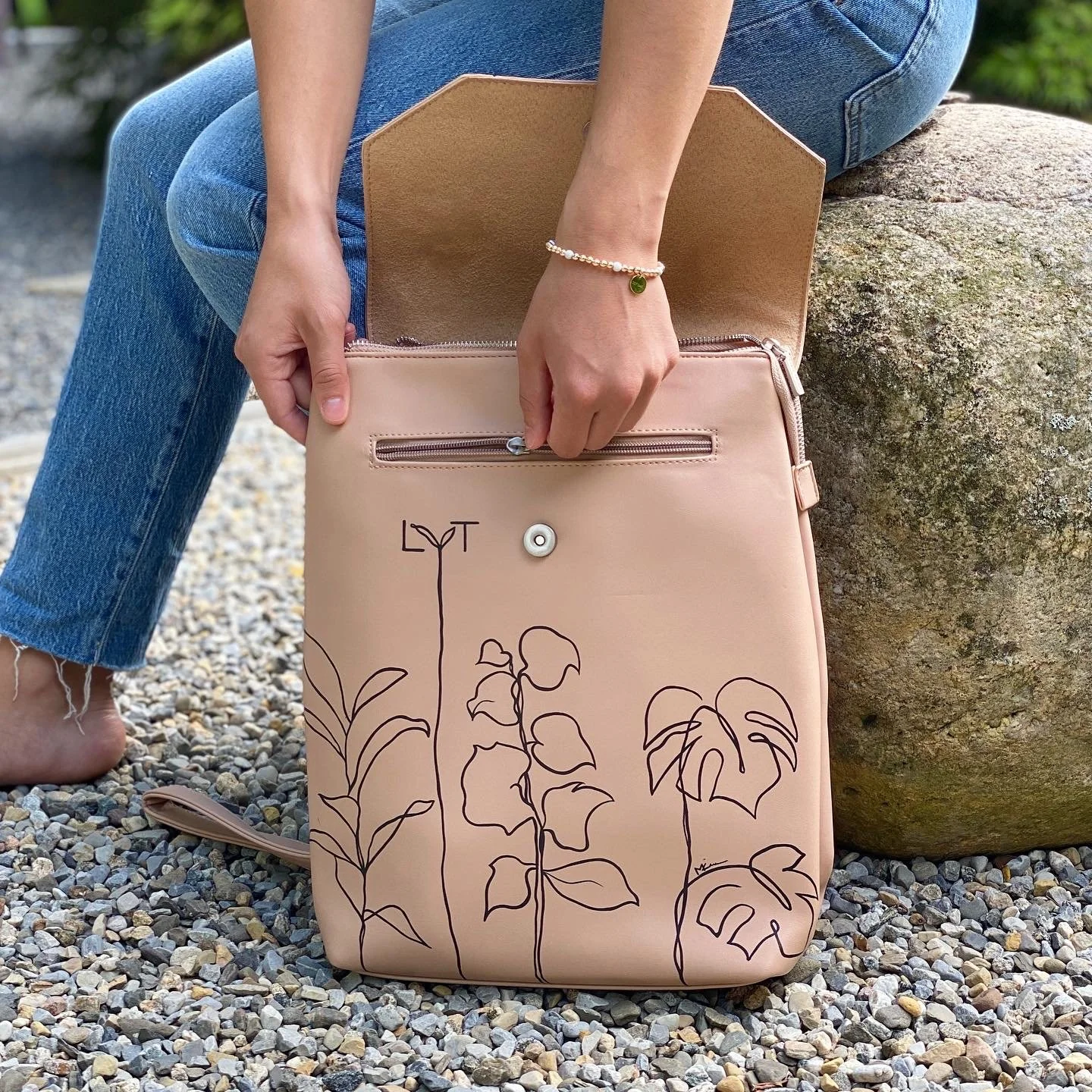 This vegan leather backpack features a simplistic plant line drawing. My favorite part was adding the initials “LVT” underneath the top flap to make this product truly personalized for this customer!