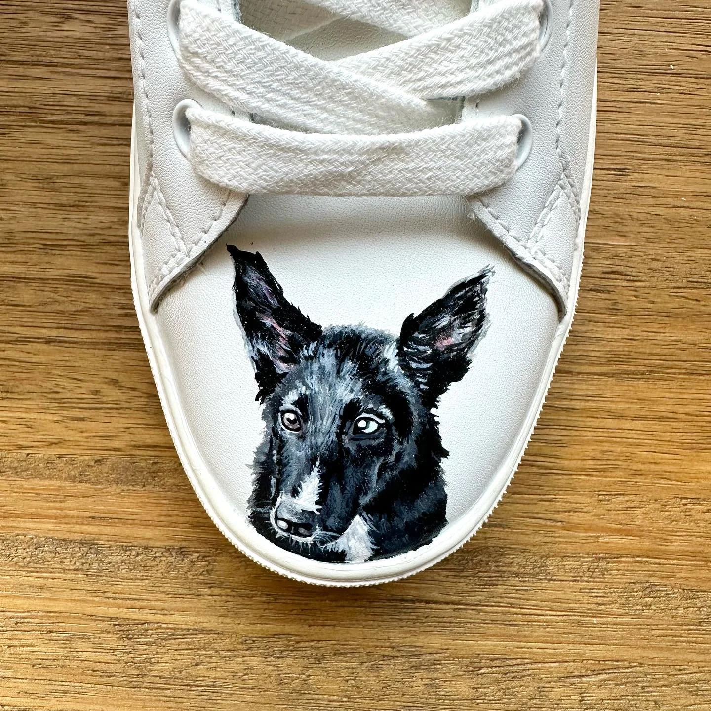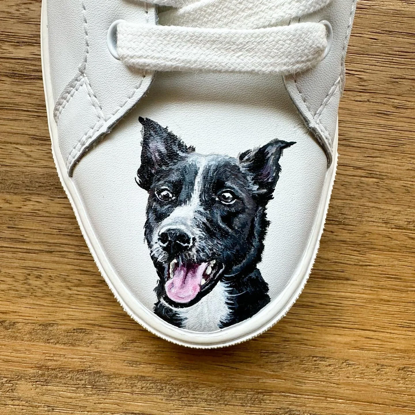This customer ordered these sneakers as a gift for his wife for their wedding reception. He requested their two dogs to be featured on the toe of each sneaker and their cat to be painted on the outside of one of the shoes. We completed the sneakers with their wedding date running down the back. I can’t think of a better way to celebrate a wedding than custom pet sneakers!