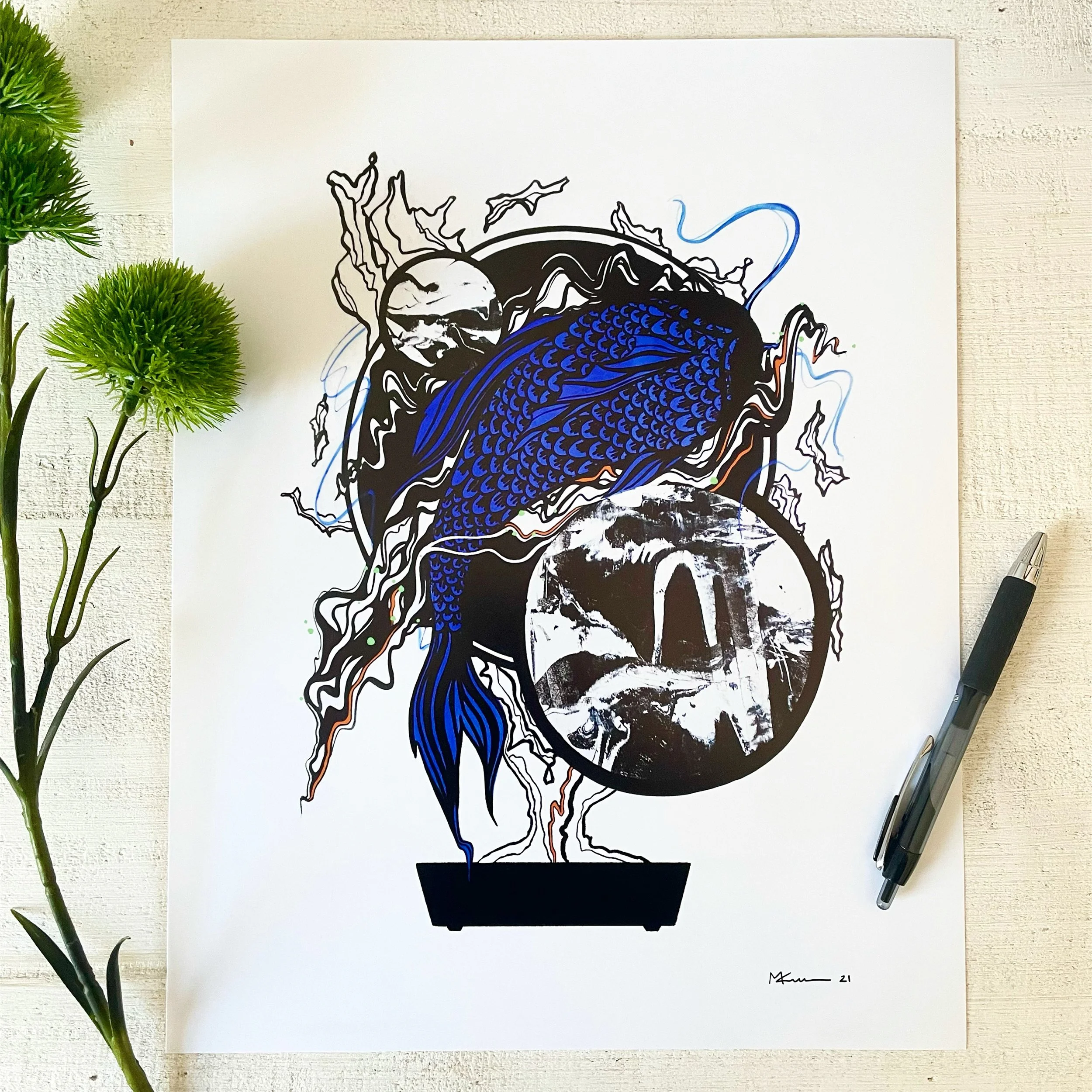 This print was made from my first drawing in a new mixed media sketchbook, and was Inspired by my dad’s passions for bonsai trees and marine wildlife.